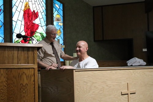 Men's Fellowship member Jere is baptized by Pastor Gary.